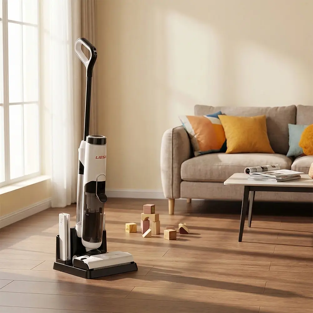 As a professional manufacturer in China, Liesa is committed to providing high-quality mop-vacuum combos. This product is equipped with a high-efficiency brushless motor for both wet and dry cleaning, delivering strong power, low noise, and long service life. It features a large LED display for clear and intuitive operation, along with a unique turbine short-hair roller brush for powerful cleaning performance. The solid-liquid separation tank allows for quick and hygienic waste disposal. Additionally, it comes with a self-cleaning and drying base to save time and effort. The innovative ergonomic carry-handle design is stylish and makes transportation easier.
