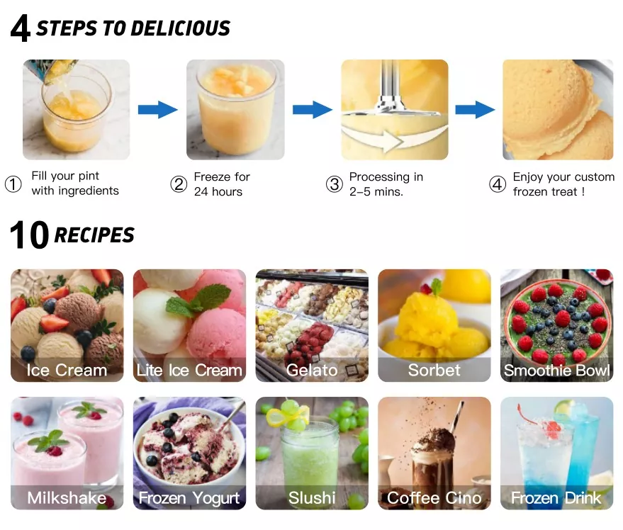 Supports the making of: light ice cream, hard ice cream, sorbet, gelato, smoothie bowls, frozen yogurt, coffee drinks, milkshakes, etc.